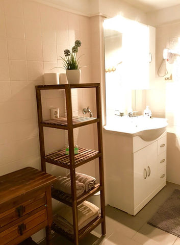 Das moderne Badezimmer bietet Ihnen u.a. einen Fön und viele Ablagen. Hand- und Badetücher sind ausreichend vorhanden und inklusive.